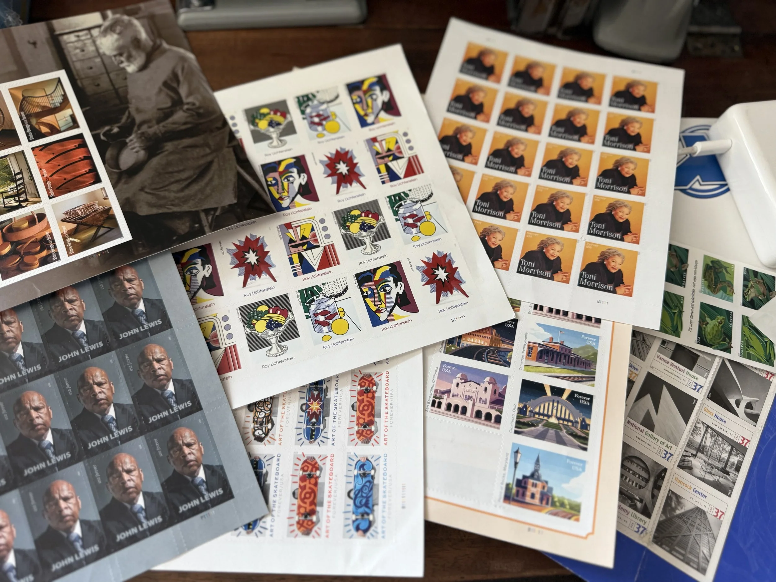 Every year the post office release 4-5 new stamps to celebrate the holidays. During this time I also buy additional stamps to use throughout out the year. I do over purchase, not because I look at stamp as an investment, which is true considering I have stamps released 15 years ago, which are worth $0.34 more than what I paid for them. But I am not in it for the money. The photo shown above, is some of the collection I have. All of them spoke to me at the time and today. My favorite is the sheet of architecture gems, which includes the Exeter Library by Louis Kahn. I wish the post office would do more artist theme stamps. Lichtenstein I believe is the last art to be released. Along with Andrew Wyeth. There was a series of WPA posters I loved as well. Those are all gone. Would love for those to come back.
